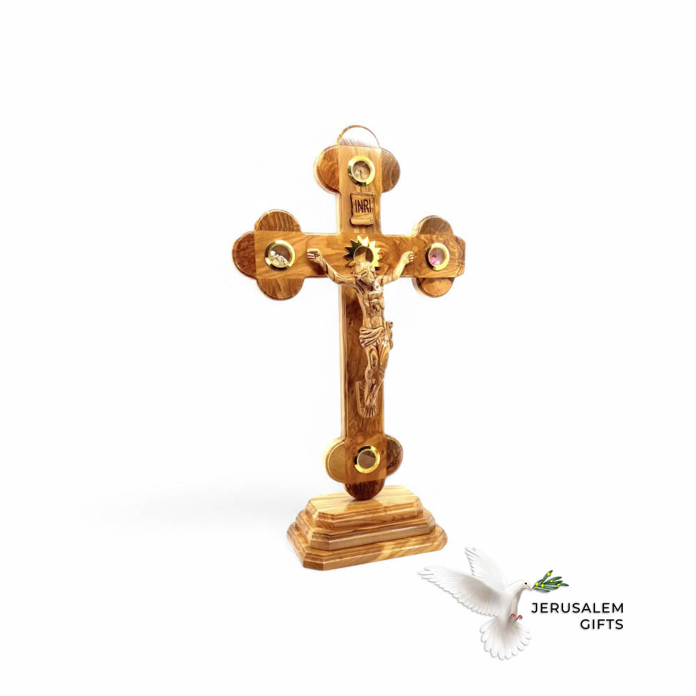 13.8″ Standing Crucifix with 2.5″ Base, Carved Corpus and 5 Holy Land Souvenirs