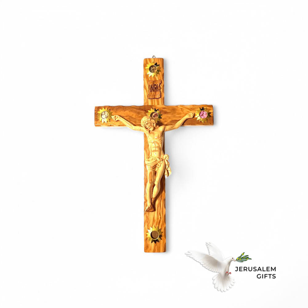 19″ Crucifix and Corpus Hand Carved Olive Wood with 5 souvenirs from the Holy Land