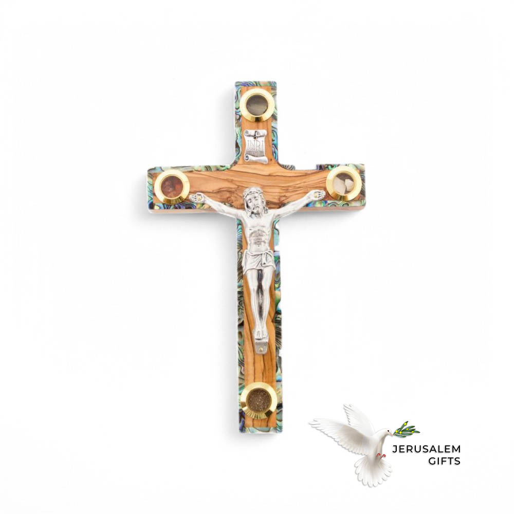 8.7″ Crucifix, Wooden Cross with Mother of Pearl, 4 Souvenirs and 14 Stations of Cross on Back