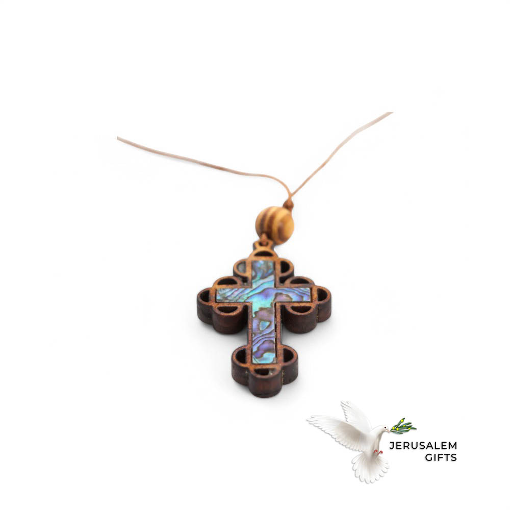 Jerusalem Cross Necklace (Olive Wood and White Mother of Pearl)