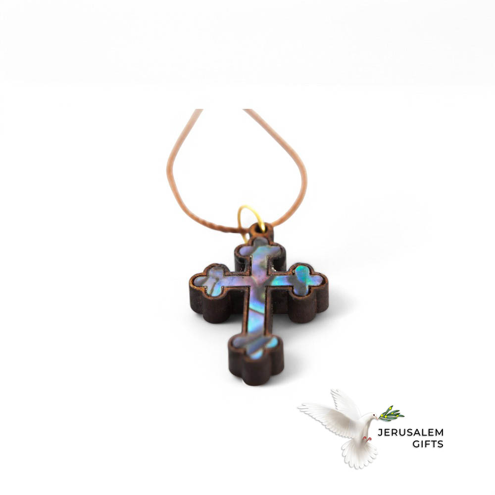 Jerusalem Cross Necklace with a Bead (Olive Wood and Colorful Mother of Pearl)