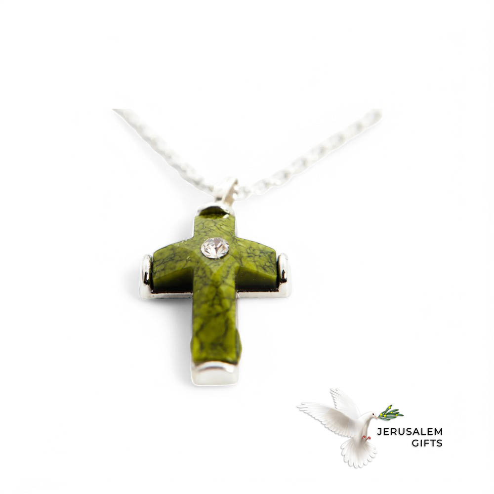 Blue Green Mother of Pearl INRI Crucifix Necklace with a Bead on Olive Wood Base