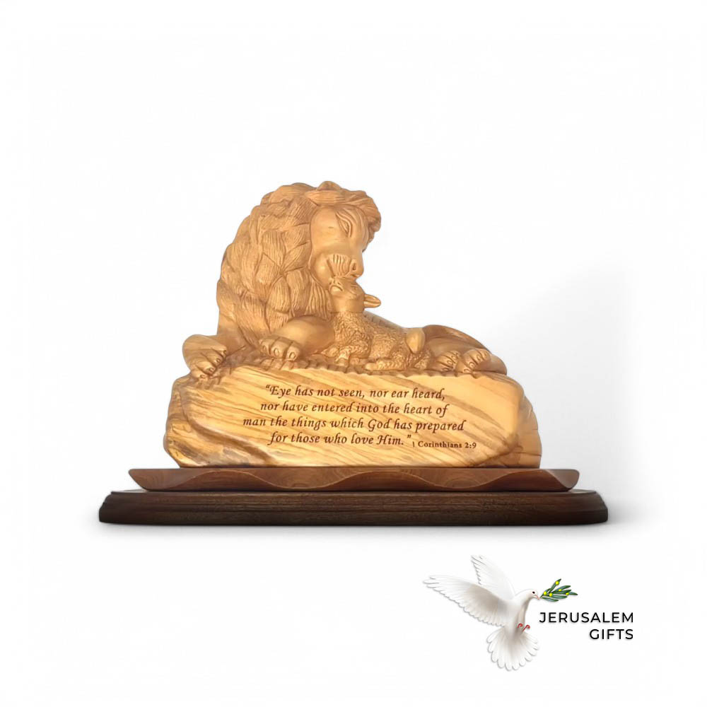 Lion with Lamb and Scripture of Corinthians, 13.8″ Masterpiece Wooden Christian Carving $1,750.00