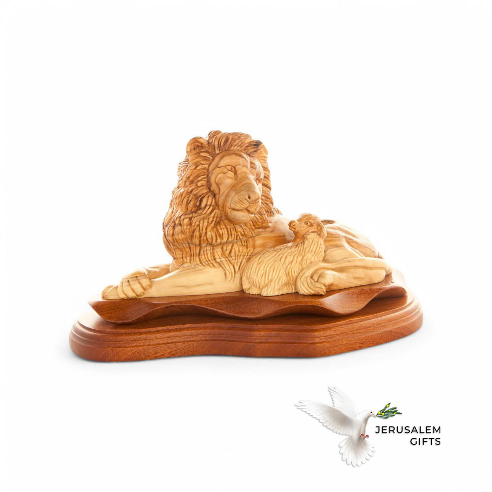 Lion with Lamb Carved Sculpture, 11.6″ Olive Wood from Holy Land