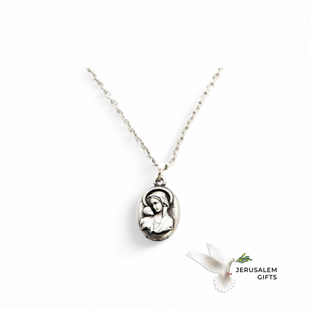 Blue Green Mother of Pearl INRI Crucifix Necklace with a Bead on Olive Wood Base