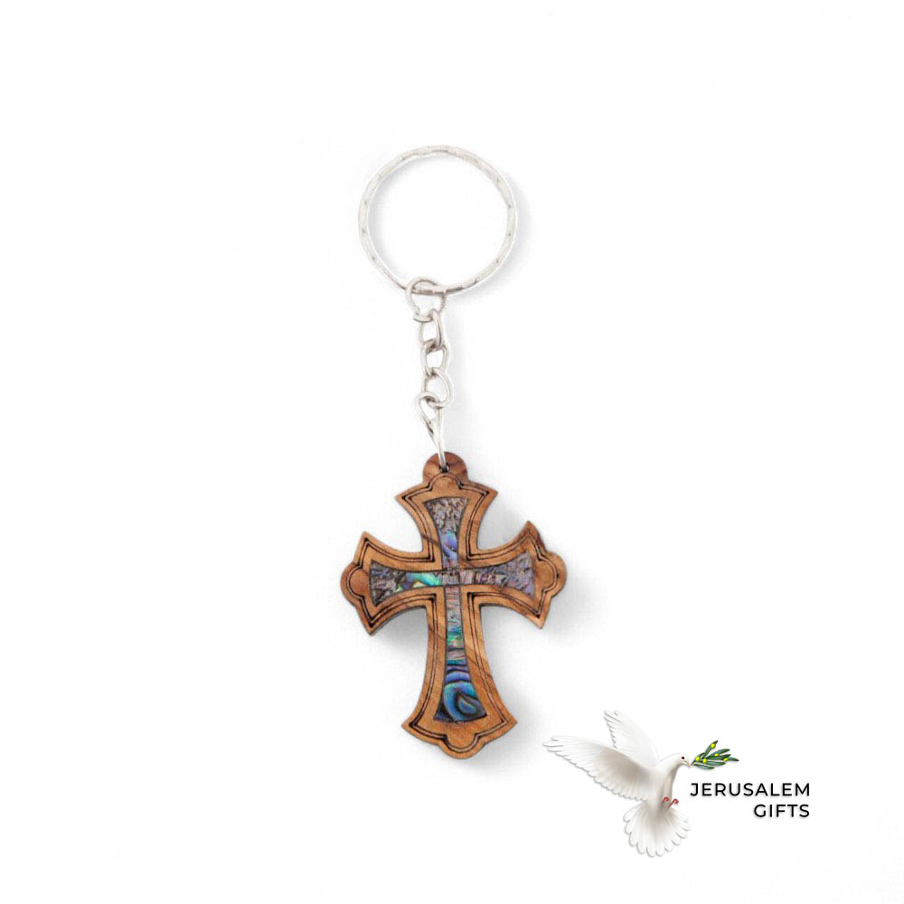 Cross Made with Mother of Pearl, Christian Keychain, Olive Wood from Bethlehem