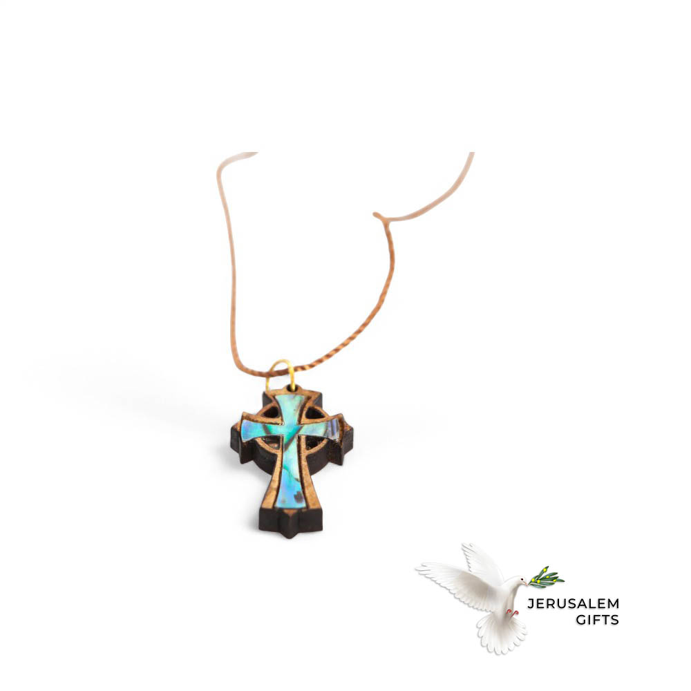 Celtic Cross Necklace with a Bead (Olive Wood and Colorful Mother of Pearl)