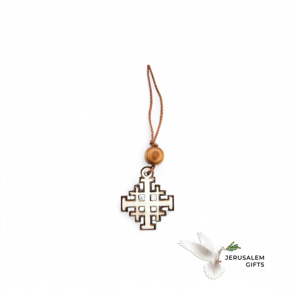 Olive Wood and White Mother of Pearl Jerusalem Cross Necklace with a Bead