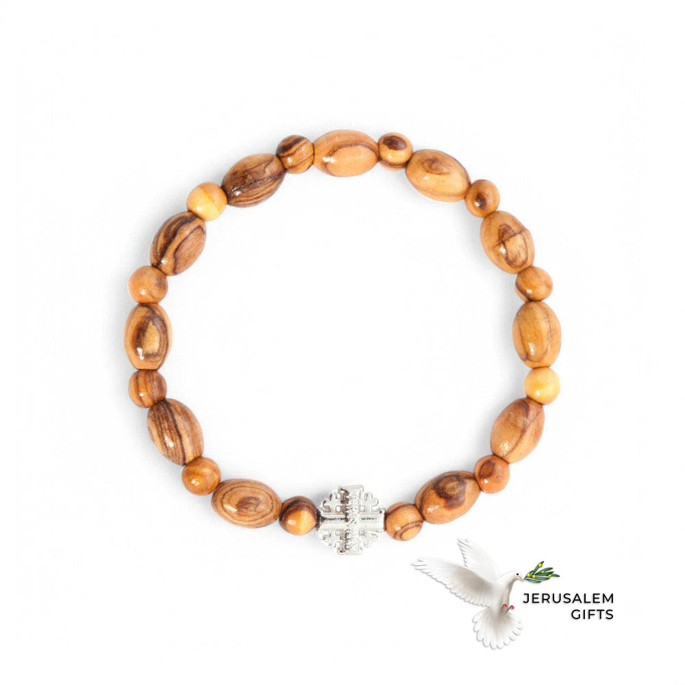 Oval Olive Wood 9 6 mm Beads Bracelet with Jerusalem Cross Pendant
