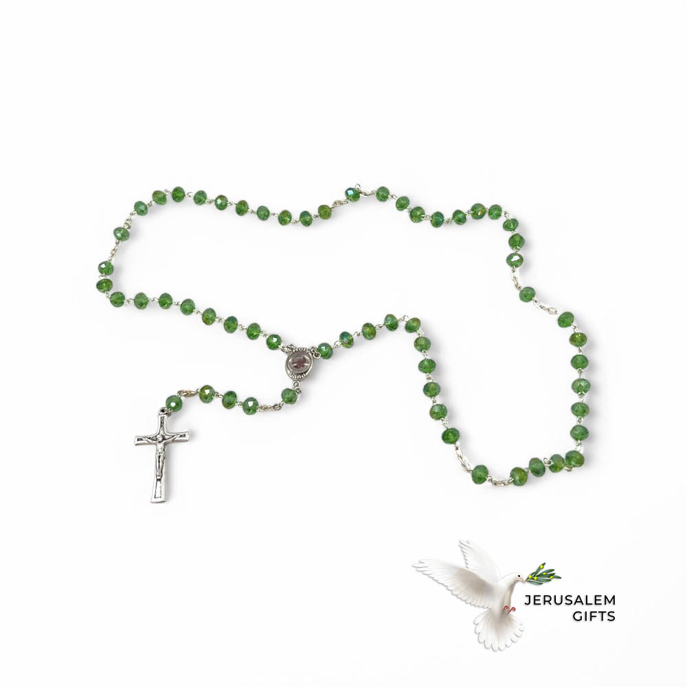 Rosary, Green Crystal Beads, 22.4″, Metal Chain, Bethlehem Handmade