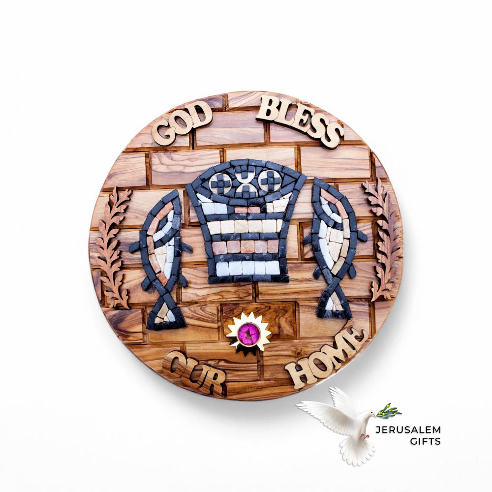 Tabgha Fish, Olive Wood and Stone Plaque, Wall Hanging 10.2″