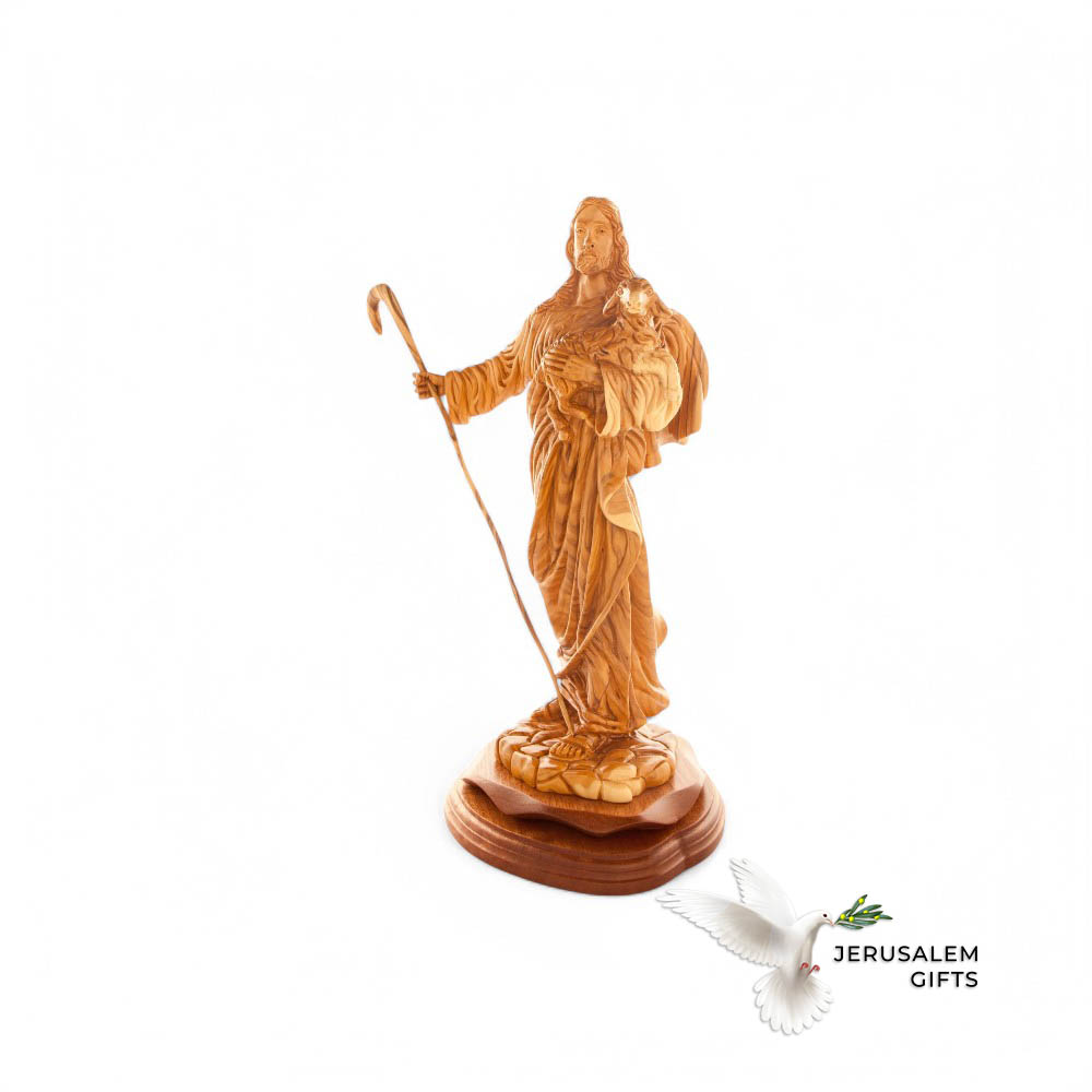 The Good Shepherd, Jesus Christ, 14.6″ Wooden Statue, Holy Land Olive Wood