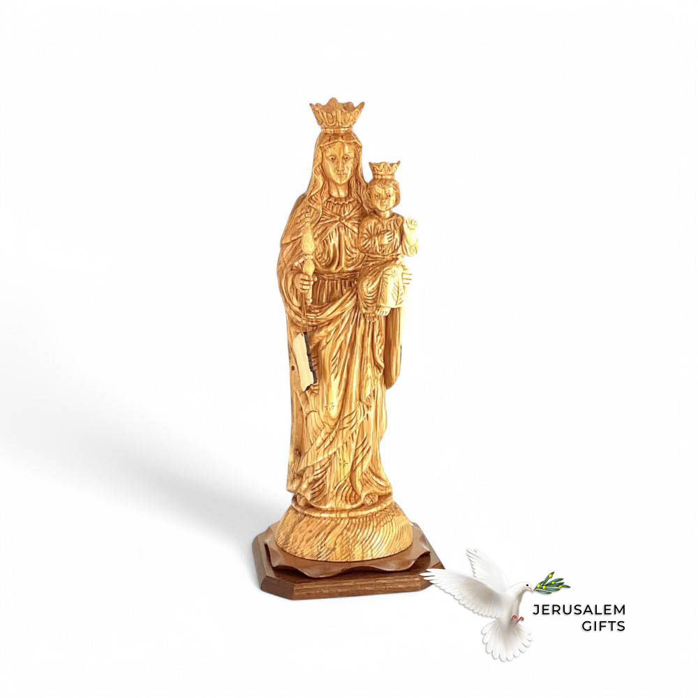 Virgin Mary “Our Lady of Mount Carmel” Statue, 17.3″ with Baby Jesus Christ Carved from Holy Land Olive Wood