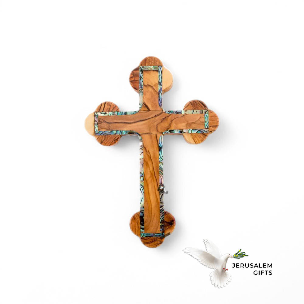Wall Cross, 7.1" , Budded Olive Wood with Mother of Pearl from Holy LandWall Cross, 7.1″ , Budded Olive Wood with Mother of Pearl from Holy Land