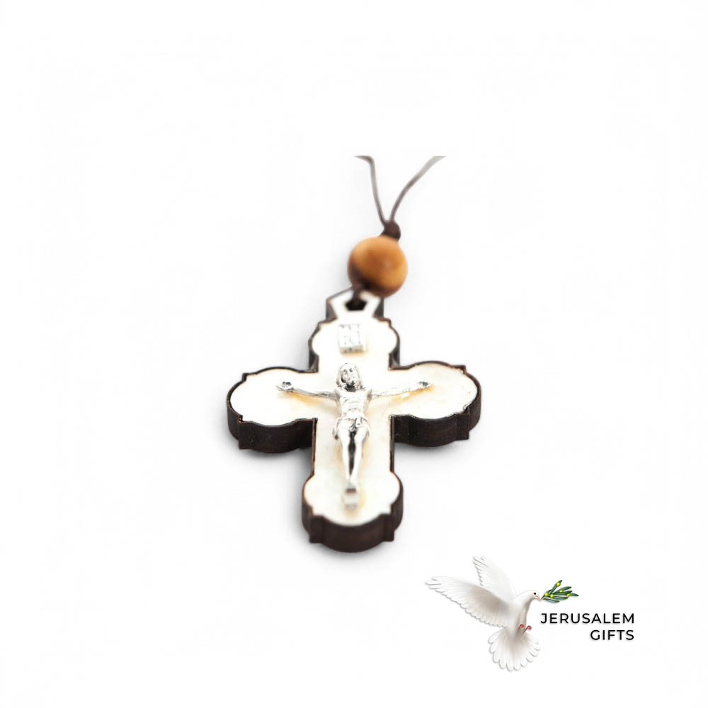 White Mother of Pearl INRI Crucifix Necklace with a Bead on Olive Wood Base